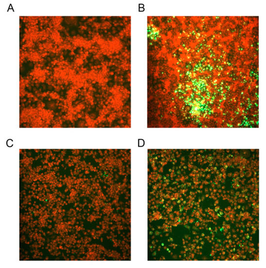 Figure 3. Immunofluorescence experiment. The recombinant virus was successfully rescued, as indicated by direct immunofluorescence, and the recombinant virus was labelled with a mouse anti-RABV N FITC-conjugated antibody. (A,C) BSR cell controls that were not infected with the recombinant virus lacked fluorescence. Green fluorescence in the cells indicates infection with the recombinant virus (B). The RVFV eGn protein in the recombinant virus was labelled with a mouse anti-RVFV Gn monoclonal antibody to identify the successful expression of RVFV eGn from the RABV vector (D).