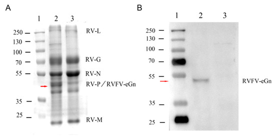 Figure 4. SDS-PAGE and Western blot analysis of virions harvested by sucrose gradient purification. (A) The positions of the RABV N, P, M, G, and L proteins were determined by SDS-PAGE. (B) Western blot analysis of purified virions probed with a monoclonal antibody against RVFV eGn. In the two images, lane 1 is the molecular mass standards, lane 2 is the rSRV9-eGn, and lane 3 is the rSRV9.