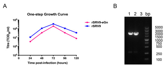 Figure 5. Growth kinetics of recombinant rSRV9-eGn. One-step growth curve comparing the kinetics of live virus replication between rSRV9 (blue) and rSRV9-eGn (pink) in BSR cells. The BSR cells were infected at an MOI of 0.1, and the supernatant was collected at 24, 48, 72, 96 and 120 h. Virus titres were measured by direct immunofluorescence (A). Identification of the stability of the insertion of the RVFV eGn gene in the recombinant virus by RT-PCR (B).