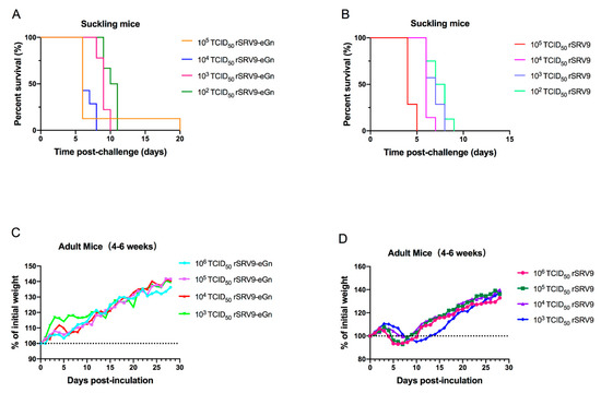 Figure 6. Pathogenicity evaluation of the recombinant rSRV9-eGn virus. Seven-day-old ICR suckling mice were inoculated intracerebrally with 50 μL of solution containing 105 to 102 TCID50 recombinant viruses (A) or control vector viruses (B), and the survival of the suckling mice was monitored daily for 21 days. Groups containing eight 4- to 6-week-old female ICR mice were inoculated intracerebrally with 50 μL of solution containing 106 to 103 TCID50 recombinant viruses (C) or control vector viruses (D), and weight changes were monitored daily for 21 days. Body weight changes in the indicated groups are shown as percentages of the body weight at day 0, which was set as 100.