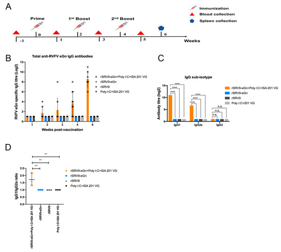 Figure 7. Analysis of the humoral response against RVFV eGn. BALB/c mice were immunized IM in the gastrocnemius muscle with either 107 TCID50 of BPL-inactivated virus supernatant with or without poly (I:C) and ISA 201 VG adjuvants or 107 TCID50 of rSRV9 vector and boosted two times with the same amount on days 14 and 28 (A). ELISA analysis of total IgG against RVFV eGn beginning at one week after the first immunization and continuing until two weeks after the last booster immunization (B). Serum antibody titres of IgG subtype (IgG1, IgG2a and IgG3) antibodies against RVFV eGn at two weeks after the last booster immunization (C). Data are shown as the mean ± SD and were analysed by two-way ANOVA. The ratios of matched IgG1/IgG2a antibody titres are plotted, and one-way ANOVA was applied to check for variance differences (D) (* P < 0.05, ** P < 0.01, *** P < 0.001, and **** P < 0.0001).