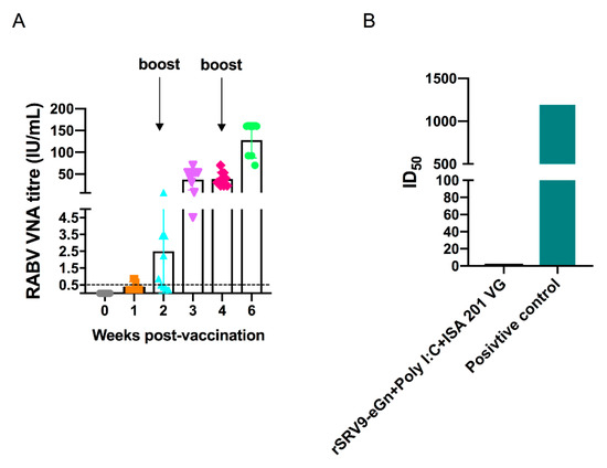 Figure 8. Virus neutralizing antibody (VNA) analysis for immunogenicity evaluation of recombinant rSRV9-eGn in mice. Serum samples collected at two weeks after the last booster immunization were analysed. The titres of VNAs specific for RABV were determined by the FAVN test and are expressed in international units (IU)/mL by using the WHO standard (A). The titres of anti-RVFV eGn neutralizing antibodies in immunized mice, compared to those in a positive control serum sample (anti-serum from RVFV DNA vaccine immunized guinea pig) [33], were detected with an in vitro pseudotyped VSV luciferase assay (B).