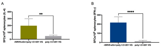 Figure 9. IFN-γ and IL-4 secretion by proliferating splenic T cells induced by a purified RVFV eGn protein. Splenocytes from immunized mice were stimulated with a purified RVFV eGn protein for 36 h, and the levels of IL-4 (A) and IFN-γ (B) were quantified by ELISpot kits. Data are shown as the mean ± SD and were analysed by an unpaired Student’s test (* P < 0.05, ** P < 0.01, and **** P < 0.0001).