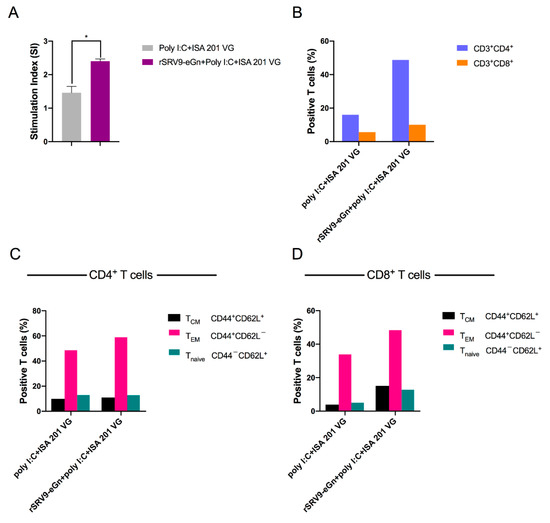 Figure 10. Antigen-specific T cell proliferation. Splenocytes from immunized mice were stimulated with the purified RVFV eGn protein for 36 h. The stimulation index (SI) of the splenocytes was detected using a CCK assay (A). T cell proliferation was analysed by using the following gating strategy: live → single cells → CD3+ → (B) CD4+/CD8+ → (C,D) CD44+/CD62L+. Central memory T cells (TCM), effector memory T cells (TEM) and naïve T cells (T naïve) were identified using CD44 and CD62L staining.