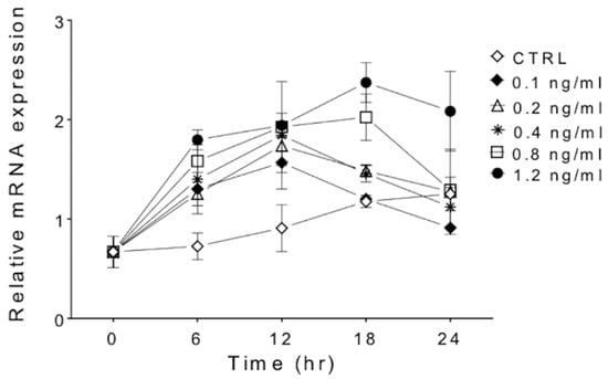 Expression of SAMHD1 mRNA was significantly (p < 0.05) higher in FeTJ cells at 6 and 12 h after treatment with 0.1, 0.2, 0.4, 0.8, and 1.2 ng/mL of IFNγ compared with controls (1.9–2.9 fold increase). At 18 h, cells exposed to 0.8 and 1.2 ng/mL of IFNγ had significantly higher SAMHD1 mRNA compared with that of the controls, and at 24 h, only cells treated with 1.2 ng/mL of IFNγ significantly differed from the controls (Figure 1). The induction of SAMHD1 mRNA was dose-dependent, with the highest concentration of IFNγ inducing the greatest increase in SAMHD1 mRNA expression. Specifically, 1.2 ng/mL of IFNγ resulted in SAMHD1 mRNA expression increases of 2.7, 2.9, 3.5, and 3.1-fold at 6, 12, 18, and 24 h post-treatment, respectively.