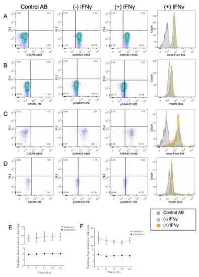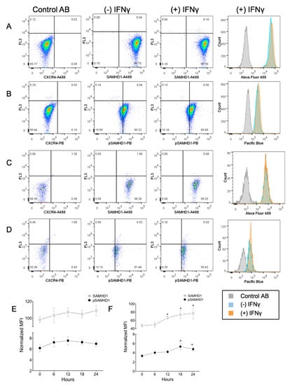 Flow cytometric assessment of a subcellular localization of total and phosphorylated SAMHD1. Whole cells (A,B) or nuclei (C,D) were stained with a fluorochrome-labeled non-binding CXCR4 antibody as the negative control, and with anti-SAMHD1 or anti-pSAMHD 6 h after treatment with 1.2 ng/mL of IFNγ. Both whole cells and nuclei were positive for SAMHD1 and pSAMHD1, but a significant increase in fluorescence associated with IFNγ treatment was noted only for the nuclear pSAMHD1 (D). Analysis over time showed that neither whole cell (E) SAMHD1 or pSAMHD1 increased significantly, but that nuclear (F) SAMHD1 and pSAMHD1 were significantly higher in treated cells at 12, 18 and 24 h, and at 18 and 24 h, respectively (*).