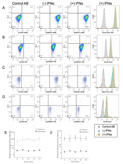 Flow cytometric analysis revealed that treatment of cells for 6 h with 1000 U/mL of IFNα did not significantly change SAMHD1 localization or phosphorylation in either whole cells or nuclei (Figure 4). Similarly, assessment over time did not reveal significant changes.
