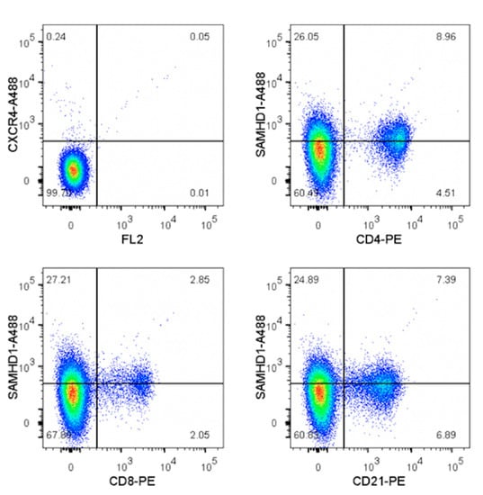 Concurrent detection of SAMHD1 with CD4, CD8, or CD21 showed that among whole PBMC, both the primary T- and B-lymphocytes were highly positive for SAMHD1, and that expression was highest (~65%) in CD4+ lymphocytes (Figure 5).