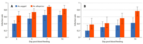 Viral infection rates after oral exposure to Aedes aegypti and Aedes albopictus. Panels (A,B) represent the rate of viral infection across time in the midgut and salivary glands, respectively. Error bars represent the 95% confidence interval.
