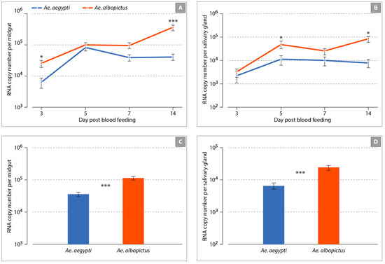 Kinetics of Mayaro (MAYV) infection of Ae. albopictus and Ae. aegypti mosquitoes. Panels (A,B) represent the number of the viral genome across time in the midgut and salivary glands, respectively. Panels (C,D) represent the mean number of viral genome for all time points. Error bars represent the standard error of the mean and asterisks indicate the significance level for statistical difference between mosquito species: * p < 0.05; *** p < 0.001; non-significant differences were not indicated for clarity.