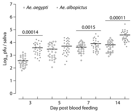 Orally infected mosquitoes were anesthetized, wings and legs were removed, and the bodies were attached to a glass slide using double-sided tape. The proboscis was manually inserted into a 10 μL low binding pipette tip filled with 10 μL DMEM containing 2% FBS. Mosquitoes saliva was collected 30 min later in a tube and stored at −80 °C until analysis. For titration, individual mosquito saliva was homogenized in 300 μL DMEM supplemented with 2% FBS, filtered through a 0.22 μm filter, and used in a plaque assay with Vero cells, as previously described [25]. Twenty mosquitoes were analyzed for each time point (3, 5, 7, and 14 days post-oral infection).