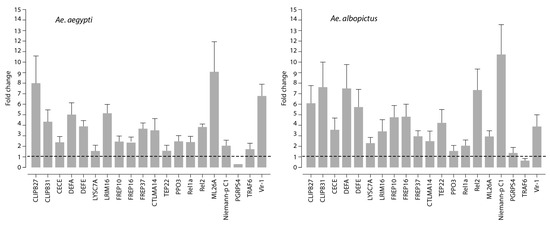 Our study also demonstrates that the expression level of the FREP family genes was upregulated in both Ae. albopictus and Ae. aegypti during infection. However, FREP10 and FREP16 mRNA was expressed to a greater in Ae. albopictus, whereas the level of FREP37 transcripts was higher in Ae. aegypti. FREP10 and FREP16 mRNA expression are reportedly upregulated in DENV-infected Ae. aegypti [37]. During ZIKV, DENV-2, or Yellow Fever virus infection, FREP37 transcripts were shown to be downregulated [37,40,41]. The FREP genes have been described as a family of putative pathogen recognition receptors for both Plasmodium and bacteria [42,43]. To the best of our knowledge, this study is the first to describe the induction of these genes during Ae. albopictus and Ae. aegypti infection with an emergent alphavirus.