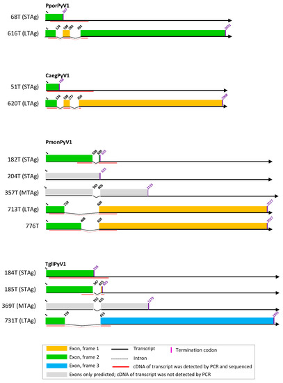 T antigen splice variants of CaegPyV1, PmonPyV1, and TgliPyV1. Experimentally identified small, middle, and large T antigens (STAg, MTag, and LTAg), and alternative TAg-encoding sequences are depicted as colored bars. STAg-, MTag-, and LTAg-encoding sequences that were predicted but not experimentally identified are depicted as gray bars. See explanatory box in the figure.