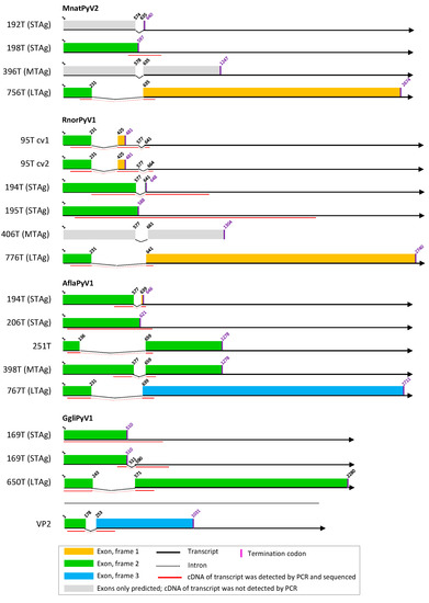 T antigen splice variants of MnatPyV2, RnorPyV1, AflaPyV1, and GgliPyV1. See legend of Figure 1.
