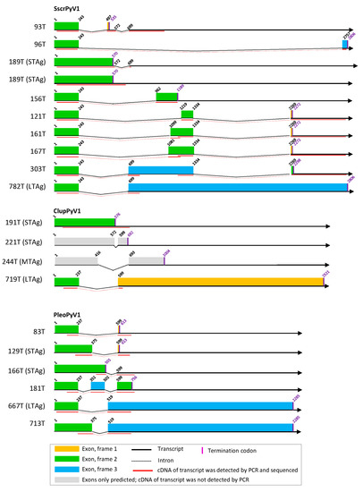 T antigen splice variants of SscrPyV1, ClupPyV1, and PleoPyV1. See legend of Figure 1.