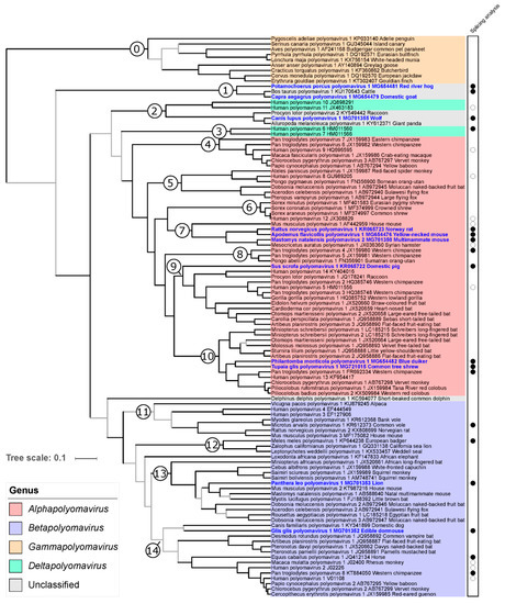 - Warden, C.D.; Lacey, S.F. Updated phylogenetic analysis of polyomavirus-host co-evolution. J. Bioinform. Res. 2012, 1, 46–49. [Google Scholar]