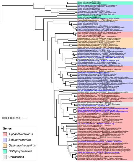 - Polyomaviridae Study Group of the International Committee on Taxonomy of Viruses; Calvignac-Spencer, S.; Feltkamp, M.C.; Daugherty, M.D.; Moens, U.; Ramqvist, T.; Johne, R.; Ehlers, B. A taxonomy update for the family Polyomaviridae. Arch. Virol. 2016, 161, 1739–1750. [Google Scholar] [CrossRef] [PubMed]