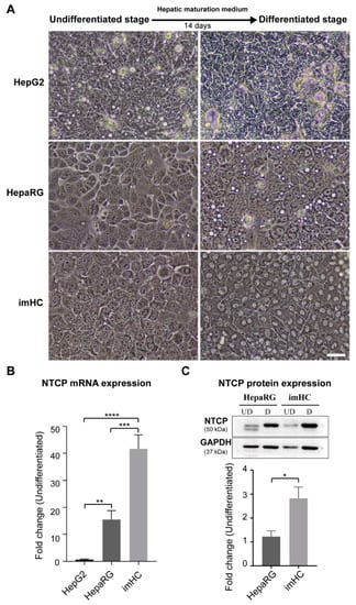 Induction of hepatic maturation of imHC and NTCP characterization in mature cells. The imHC, HepaRG and HepG2 were maintained in hepatic maturation medium for two weeks. Hepatic architectures, such as a cord-like structure, bi-nucleated and polygonal-shaped morphology, signified exclusively the differentiated stage of imHCs (A). The scale bars represented 50 µm. After maturation induction, NTCP expression was significantly increased in both imHC and HepaRG (B). The level of NTCP protein after normalization with GAPDH was higher in imHC than in HepaRG (C). Data are presented as mean ± SD. *, **, *** and **** represented statistical different data with a p-value < 0.05, < 0.01, < 0.001 and < 0.0001 respectively.