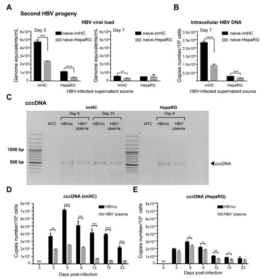 The imHCs infected with either HBVcc or HBV+ plasma produced the second HBV progeny and accumulated a covalently closed circular DNA (cccDNA) pool. Naïve imHC and HepaRG were infected with conditioned medium collected from HBVcc infected hepatocytes and monitored for extracellular HBV (viral load) on days 3 and 7 (A), as well as intracellular HBV DNA on day 7 (B). The cccDNA PCR products were analyzed using agarose gel electrophoresis on day 9 and day 23 post-infection (C). The cccDNA pool in either imHCs (D) or HepaRG (E) after being infected with HBVcc or HBV+ plasma was expressed as copies number /106 cells. Data are presented as mean ± SD. *, **, *** and **** represented statistical different data with a p-value < 0.05, < 0.01, < 0.001 and < 0.0001, respectively. ND represented undetectable.