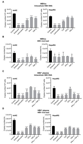 The naïve imHCs and HepaRG were cultured onto 6-well plates for two weeks in differentiated medium. For HBV entry inhibitor, hepatocytes were pre-treated with 4 µM cyclosporine A for 2 h prior to infection, with HBV particles derived from HBVcc or HBV+ plasma. Cyclosporine A was maintained at 4 µM in culture medium for 15 days. For treatment with nucleos(t)ide analogs and antiviral cytokines, imHCs and HepaRG were infected with HBV for 24 h. Infected hepatocyte was treated with 1 µM lamivudine, 1 µM entecavir (ETV), 10 ng/mL TNF-α, 100 IU/mL interferon-α (IFN-α) or 100 IU/mL interferon-γ (IFN-γ) for 15 days. The conditioned medium from infected hepatocytes, mock infection and drug treated group were collected for viral load determination. On day 15, infected imHCs and HepaRG were measured for intracellular HBV DNA.