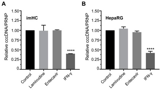 Interferon gamma (IFN-γ) is critical for innate and adaptive immunity against HBV infection by targeting cccDNA. For the cccDNA reduction assay, lamivudine, entecavir or IFN-γ were added to the culture medium on days 3–7 post-infection and the cccDNA level was normalized with PRNP. The quantitative real-time PCR revealed that nucleos(t)ide analogs (lamivudine and entecavir) could not decrease this cccDNA level (Figure 6A,B). IFN-γ decreased the cccDNA level by 60% in imHC and 58% in HepaRG, respectively (Figure 6A,B).