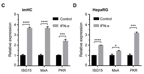 The reduction of HBV cccDNA and the upregulation of antiviral signaling in infected hepatocytes after the treatment with interferon-γ (IFN-γ) and interferon-α (IFN-α), respectively. Mature imHC and HepaRG were infected with HBV and treated with DAAs as well as IFN-γ. The relative cccDNA level in imHC in response to DAAs and IFN-γ was measured and normalized with PRNP in imHC (A) and in HepaRG (B). The upregulation of antiviral signaling genes (interferon-stimulated gene 15 (ISG15), human myxovirus resistance protein 1 (MxA) and protein kinase R (PKR)) in response to IFN-α treatment were monitored in imHC (C) and HepaRG (D). Data are represented as mean ± SD. *, **, *** and **** represented statistical different data with a p-value < 0.05, < 0.01, < 0.001 and < 0.0001 respectively.