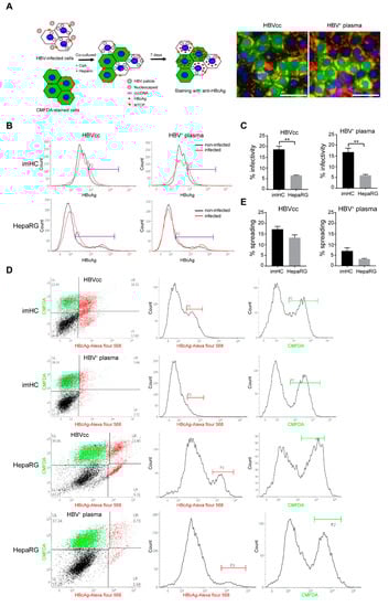 HBV enters naïve hepatocytes via NTCP and spreads via intercellular infection. HepaRG and imHCs were examined for hosting lateral HBV infection or spreading. Seven-day post-infection, HepaRG or imHCs were co-cultured with naïve hepatocytes pre-strained with 1 µM CellTracker™ Green CMFDA Dye for 7 d. Naïve and infected cells were treated with 4 µM cyclosporine A to block HBV infection from the supernatant via NTCP. One week after the co-culture, hepatocytes were harvested and strained with anti-HBV core antigen (HBcAg) monoclonal antibody. The stained hepatocytes were analyzed using a flow cytometer and the double positive staining with HBcAg and CMFDA were designated as HBV spreading. The procedure of spreading experiment was illustrated (Figure 7A and Figure S5). The infectivity of HBV in imHCs and HepaRG was evaluated by staining with anti-HBcAg and analyzing by a flow cytometer. The imHCs and HepaRG carrying HBcAg were designated as P2 population (Figure 7B). Infection of imHC and HepaRG with HBVcc yielded 18.64% and 6.48%, infectivity respectively. Changing the HBV source to HBV+ plasma (n = 3) yielded 16.78% and 5.93% infectivity in imHC and HepaRG, respectively. The HBV infectivity revealed that imHC supported HBV infection approximately 3-fold higher than HepaRG (Figure 7C). To assess the potential of HBV spreading from infected hepatocytes to naïve cells, infected imHC or HepaRG was co-cultured with non-infected CMFDA-strained imHC or HepaRG. After being co-cultured for 7 d, almost 17.25 ± 1.88% of CMFDA-stained imHCs were positive for HBcAg staining. For HepaRG, nearly 13.31 ± 1.81% CMFDA-stained cells were positive for HBcAg staining. Incubating imHC or HepaRG with HBV+ plasma and co-cultured with non-infected CMFDA-stained imHC or HepaRG for 7 d, more than 7 ± 1.21% CMFDA-stained imHCs were positive for HBcAg staining. However, at least 3.15 ± 0.46% of CMFDA-stained HepaRG were positive for HBcAg straining 2-fold lesser than that of imHC (Figure 7D). The co-culture of uninfected hepatocytes with non-infected CMFDA-stained cells were used as the negative control, where positivity for HBcAg straining was 0.13% and 0.04% in imHCs and HepaRG, respectively. These results demonstrated that imHCs and HepaRG infected with either HBVcc or HBV+ plasma supported viral spreading as demonstrated through the co-culture system.