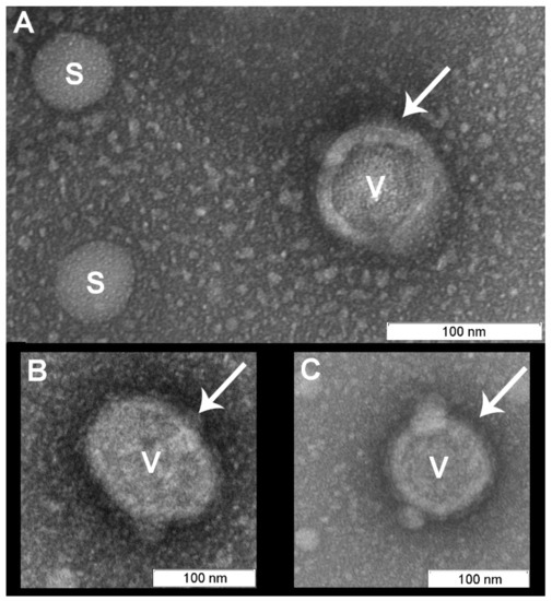 Figure 4. Virions (“V”) irradiated for 20 min with photosensitizer (2 µM) remained structurally normal with membranes maintaining their structural integrity. The spikes appeared to be absent from the viral membranes, however the “halo” may indicate the presence of glycoproteins (marked with arrows). Spherical vesicles (diameter 30–50 nm, marked “S” (A), the similar structures can be recognized on virions surface (B, C)) and grain-like small (5–15 nm) structures were visible and were not observed in the controls. Scale bar 100 nm.