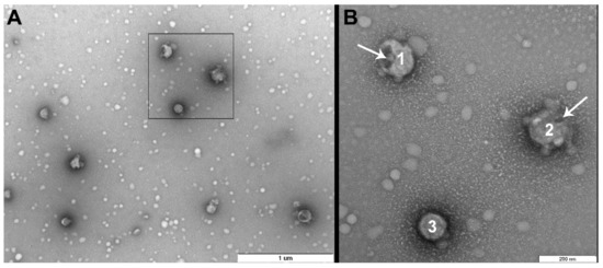 Figure 5. Virions after photodynamic inactivation (PDI) (4 µM photosensitizer). (A) Low magnification (scale bar 1 µm); (B) Magnified area denoted by black box in (A) (scale bar 200 nm). It is possible to distinguish two different forms of “bald” virus particles: smooth spherical virions (“3”) and virions with damaged membranes (“1” and “2”). Membrane damage or “dark windows” are marked with arrows.