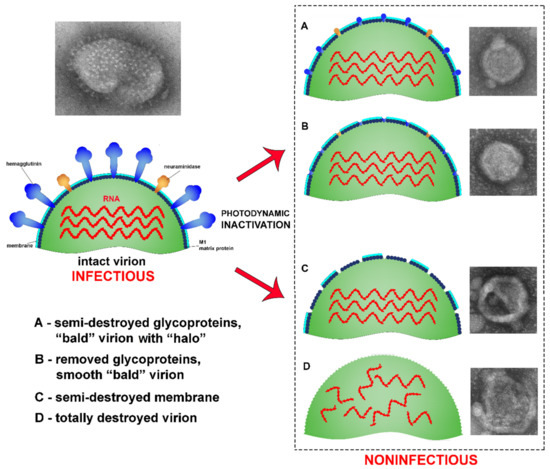 Here, we investigated the ultrastructural properties of photodynamic inactivation of H5N8 influenza virus. We demonstrate that PDI treatment of the virus induces the removal of viral surface glycoproteins and makes virions non-infectious even without membrane damage. Because proteins are readily oxidized by singlet oxygen [13], hemagglutinin, the viral fusion surface glycoprotein, might be particularly susceptible to the singlet oxygen produced by PDI. Overall, three distinct forms of virion damage were induced by photodynamic inactivation. We observed “bald” virions with membranes keeping structural integrity, virions with damaged membranes and virions that were totally destroyed (Figure 8). We show that all three forms are non-infectious (Table 1).