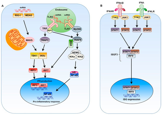 Innate immune response to positive-stranded RNA viruses and interferon (IFN) signalling. (A) IFN production is induced when single-stranded RNA (ssRNA) (TLR7, RIG-I) or double-stranded RNA (dsRNA) (TLR3, RIG-I, MDA5) is detected in the cell. Signalling through these pattern recognition receptors (PRRs) will ultimately result in the translocation of NF-κB, IRF3 and IRF7 to the nucleus. These transcription factors then initiate production of IFNs and pro-inflammatory cytokines. (B) Type I IFNs bind to a receptor composed of IFNAR1 and IFNAR2, while type III IFNs signal through IFNLR1 and IL10RB. The two types of signalling pathways then converge and result in the expression of interferon-stimulated genes (ISGs).