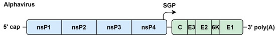 Alphaviruses have a genome of around 12kb containing a 5’-terminal cap and a 3’-terminal poly(A) tail (Figure 3). The genome consists of two ORFs; the 5’-terminal ORF encodes the nonstructural proteins, and the 3’-terminal ORF encodes the structural proteins. Consequently, two polyproteins are produced which are cleaved by viral and host proteases into four nonstructural proteins (nsps) and five structural proteins (C, E3, E2, 6K, E1). The nsps are expressed from the genomic RNA and are involved in viral replication. The structural proteins are expressed from a subgenomic RNA and are the essential components of the new viral particles [90,91].