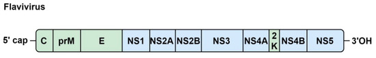 Flaviviruses have a genome of around 11 kb containing a 5’-terminal cap, but they lack a poly(A) tail (Figure 4). The genome encodes one large polyprotein that is processed by viral and host proteases into the three structural proteins (E, C and prM) and the seven nonstructural proteins (NS1, NS2A, NS2B, NS3, NS4A, NS4B and NS5). The nonstructural proteins are involved in viral replication and modulation of host responses, while the structural proteins comprise the components that are assembled into new viral particles [113].