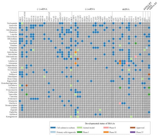 Forty-three safe-in-man BSAAs used in this study reached different stages of drug development process (Figure 1, Tables S2 and S3). Altogether, these BSAAs inhibit the replication of 52 viruses belonging to (−) single-stranded (ss)RNA, (+)ssRNA, ssRNA-reverse transcriptase (RT), ssDNA, double-stranded (ds)DNA, or dsDNA-RT virus groups.