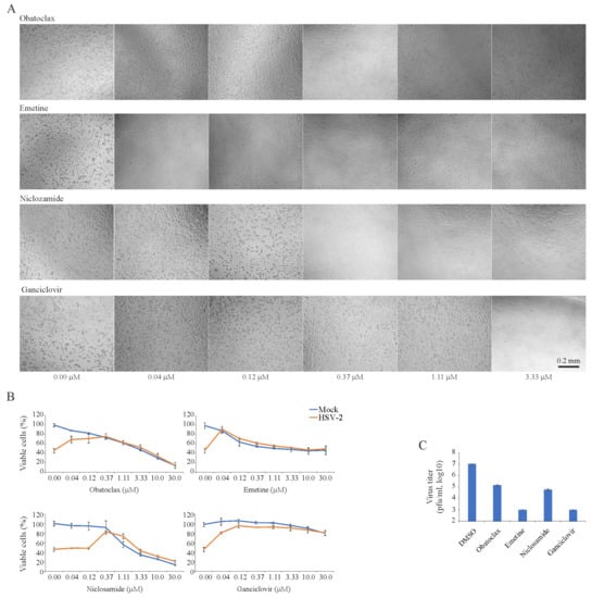 Effect of obatoclax, emetine, niclosamide and ganciclovir on the viability of mock- and herpes simplex virus type 2 (HSV-2)-infected retinal pigment epithelial (RPE) cells and the production of infectious virus particles in these cells. (A) RPE cells were treated with increasing concentrations of a compound and infected with HSV-2 (moi, 0.1). Cells were imaged after 72 h in the phase-contrast mode. (B) RPE cells were treated with increasing concentrations of a compound and infected with mock- or HSV-2 (moi, 0.1). The viability of the cells was determined to be 72 hpi with the CTG assay. Mean ± standard deviation (SD); n = 3 (experimental replicates). (C) HSV-2 production in RPE cells treated with obatoclax (0.12 μM), emetine (0.04 μM), niclosamide (0.37 μM), ganciclovir (3.33 μM) or DMSO-treated as measured by plaque assay using A549-Npro cells (Mean ± SD; n = 3).