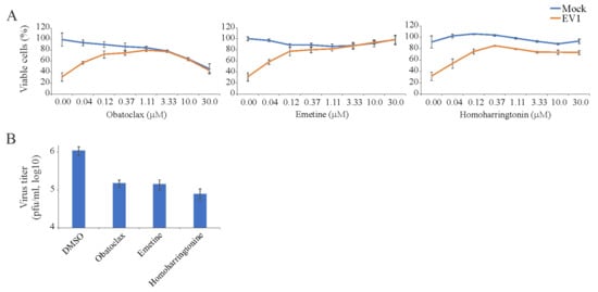 Similarly, we examined 43 BSAAs against wild-type EV1 in RPE cells. We monitored the viability of mock- and virus-infected cells by microscopy and the CTG assay. After the initial screening, we identified three compounds (obatoclax, emetine, and homoharringtonine), which rescued cells from virus-mediated death at none-cytotoxic concentrations. To determine the efficiency and toxicity of novel EV1 inhibitors, we measured the viability of mock- and virus-infected cells after 48 h using the CTG assay (Figure 3A). The Sis for obatoclax, emetine, and homoharringtonine were 25, >300, and >300, respectively (Table S4). We titrated EV1 produced from drug-treated and non-treated cells in A549-Npro cells (Figure 3B). The experiment revealed that all three compounds lowered the production of EV1, confirming novel antiviral activities of obatoclax, emetine, and homoharringtonine.