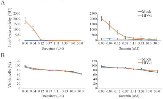 3.4. Brequinar and Suramin Inhibit HIV-1-Mediated Luciferase Expression in TZM-bl Cells
