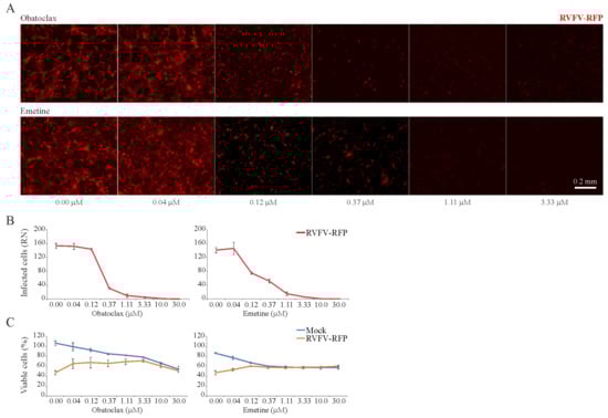 Effect of obatoclax and emetine on Rift Valley fever virus (RVFV)-mediated red fluorescent protein (RFP) expression and on the viability of mock- and virus-infected RPE cells. (A,B) RPE cells were treated with increasing concentrations of a compound and infected with RVFV-RFP (moi, 1). After 24 h, the cells were imaged and fluorescence intensity was quantified (Mean ± SD; n = 3). (C) Cell viability was determined using the CTG assay (Mean ± SD; n = 3).