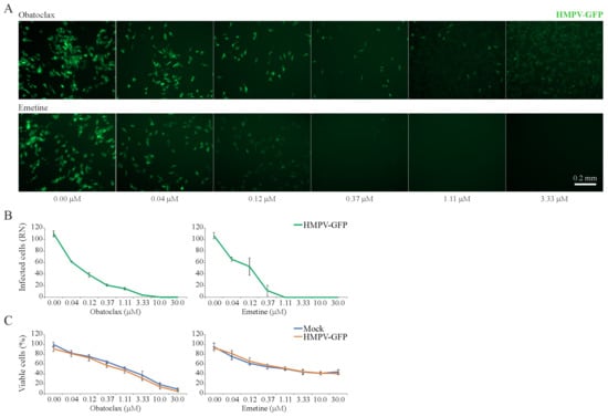 Effect of obatoclax and emetine on metapneumovirus (HMPV)-mediated green fluorescent protein (GFP) expression and on the viability of mock- and virus-infected RPE cells. (A,B) RPE cells were treated with increasing concentrations of a compound and infected with HMPV-GFP (moi, 0.1). After 96 h, the cells were imaged and fluorescence intensity was quantified (Mean ± SD; n = 3). (C) Cell viability was determined with the CTG assay (Mean ± SD; n = 3).