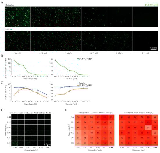 To test whether the obatoclax-emetine combinations act synergistically against FLUAV-mediated GFP expression and rescue infected cells from death, the observed responses were compared with expected combination responses. The deviations in observed and expected responses showed no synergistic effect (Figure 7D,E; Figure S1). This result indicates that obatoclax and emetine target distinct cellular pathways essential for virus infection.