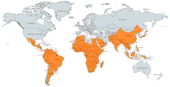 The word “primate” is derived from Latin primat that means prime or first rank. The Primates order has the third most abundant number of species among mammals, only behind Chiroptera (bats) and Rodentia (rodents) [3]. Although the exact number of species is still in discussion with constant changes in taxonomic classification, there are between 261 and 504 species described to date divided into 16 families and 79 genera [3,4]. Primates are distributed across four global regions: Latin America, mainland Africa, Madagascar, and Asia, covering 90 countries (Figure 1) [3]. Common features of the Primates order include a large brain in relation to the body size, accurate binocular color vision, opposable thumbs and a sophisticated social system. The common ancestor of the Primates order is estimated to have originated about 60–80 million years ago (MYA) based on evidence of small mammals adapted to live in trees and with the oldest fossil found in Africa [5].