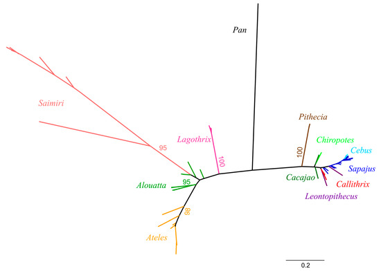 Phylogenetic relationships of simian foamy viruses from neotropical primates (NPs). Unrooted tree inferred by maximum likelihood analysis of an alignment of 411 nucleotides of partial polymerase sequences with 1000 bootstrap replicates. Different NP genera and bootstrap values are indicated by distinct colors. Distance bar is shown at the bottom.