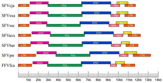 Structural organization of complete simian foamy virus (SFV) and feline foamy virus (FFV) genomes. SFVcja (Callithrix jaccus), SFVsxa (Sapajus xanthosternos), SFVssc (Saimiri sciureus), SFVaxx (Ateles sp.), SFVbar (Brachyteles aracnoides), SFVptr (Pan troglodytes), FFVfca (Feline catus). LTR, long terminal repeat; GAG, group specific antigen, POL, polymerase; ENV, envelope; TAS, transcriptional activator; BEL2, between the ENV and LTR.