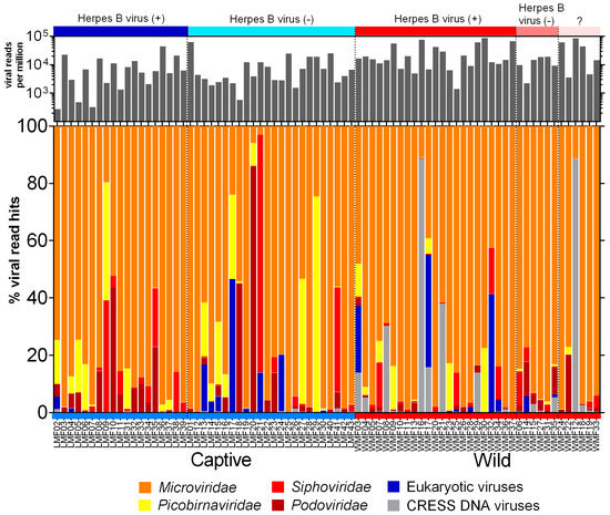 The percentage of viral reads matching six virus groups among wild and captive macaques. The color labels at the top of the figure present the herpes B virus infections. The black bar plot above the color bar shows the normalized total viral read numbers matching viruses shown below.