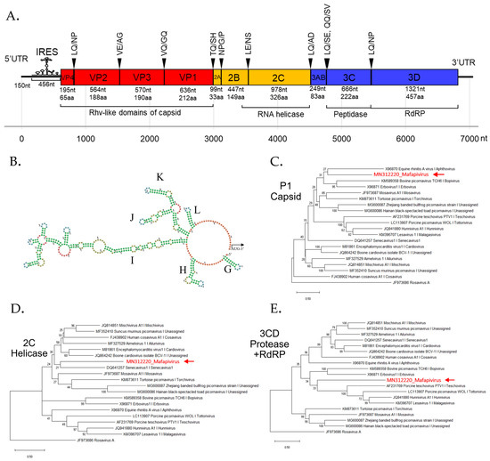 The phylogenetic analysis of Mafapivirus 1 based on P1, 2C, and 3CD amino acid sequences was performed with members of supergroup 1 as shown in Figure 3C–E. The analysis confirmed that this virus was highly divergent from all recognized genera as well as other, unclassified, picornaviruses.