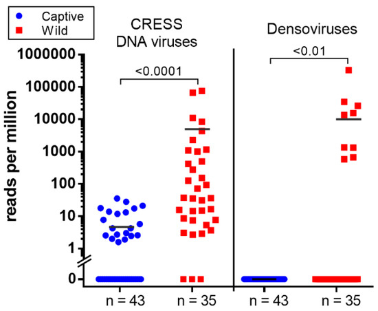 The scatter dot plot represents the relative abundance calculated as reads per million (RPM) of two group of viruses; CRESS DNA virus and densoviruses detected in wild and captive macaque. Both viruses show significantly higher abundance in wild group (Mann–Whitney U test; p < 0.05).