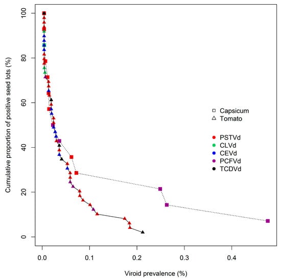 Cumulative distribution curves of viroid prevalences in contaminated tomato and capsicum seed lots presented for importation into Australia. Curves display the cumulative proportion by percentage (y-axis) of contaminated seed lots with viroid prevalences greater than, or equal to, the fractional rate (%) of prevalence identified on the x-axis. See text for full names of viroids.