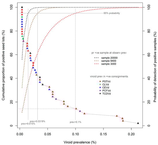 The proportion of the laboratory-identified contaminated seed lots to which such prevalence levels would be expected to apply can be determined by extending a horizontal line (Figure 2, grey dashed) from the point of intersection of the “plumb line” and the cumulative distribution curve to the left vertical axis. Thus, the use of a sample size of 3000 seeds would be expected, at a confidence level of 95%, to have detected approximately 15% of the identified contaminated seed lots, namely, the seven lots with a viroid prevalence of 0.1% or more. The same rationale and method indicates that use of a sample size of 9400 seeds would be expected to have detected approximately 42% of all contaminated seed lots, in this instance being the 20 lots with an estimated viroid prevalence of 0.032% or more.