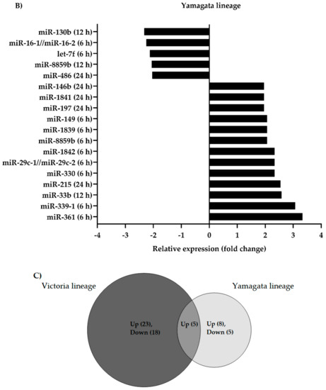 The miRNA expression profiles in each lineage of influenza B virus infection. Madin–Darby canine kidney (MDCK) cells were infected with mock, Victoria, or Yamagata lineage at multiplicity of infection (MOI) = 0.01, and collected at 6, 12, 24 hpi. (A) Forty-six microRNAs were dysregulated in the cells infected with Victoria lineage. (B) Eighteen microRNAs were in the cells infected with Yamagata lineage. (C) Venn–Euler diagram shows unique and overlapped microRNA expressions in Victoria and Yamagata lineages.