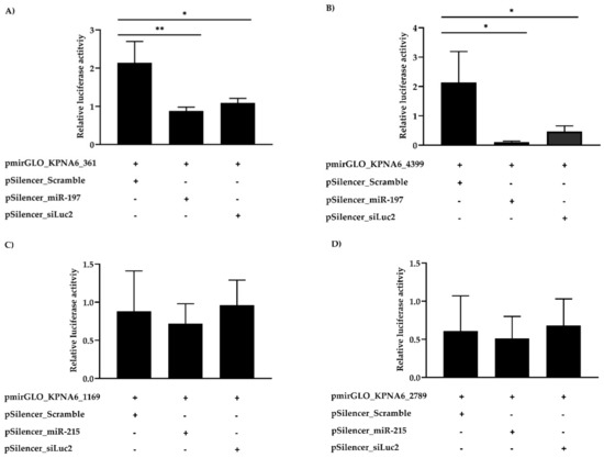 Luciferase activity. The MDCK cells were co-transfected with a reporter vector containing the target site of cfa-miR-197 and cfa-miR-215 (designated as pmirGLO_KPNA6) and a silencing vector encoding for scramble, cfa-miR-197, cfa-miR-215, siLuc2 (designated as pSilencer). (A) To determine whether the 3′-UTR position at 361–367 of the KPNA6 transcript was a target of cfa-miR-197. (B) To determine whether the 3′-UTR position at 4399–4405 of the KPNA6 transcript was a target of cfa-miR-197. (C) To determine whether the 3′-UTR position at 1169–1176 of the KPNA6 transcript was a target of cfa-miR-215. (D) To determine whether the 3′-UTR position at 2789–2790 of the KPNA6 transcript was a target of cfa-miR-215 (p ≤ 0.05 is designated as *; p ≤ 0.01 is designated as **).